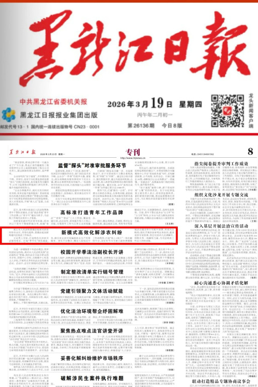 3月23日,密山市人民法院沈国凤撰写的《新模式高效化解涉农纠纷》一文,刊发于《黑龙江日报》第八版专刊。