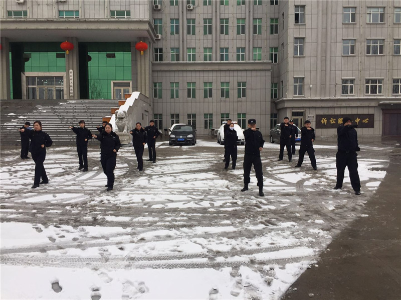 密山法院法警大队在开展“以案为鉴自律、改进司法作风”专题警示教育活动中,通过开展擒敌拳考核,提高业务技能。